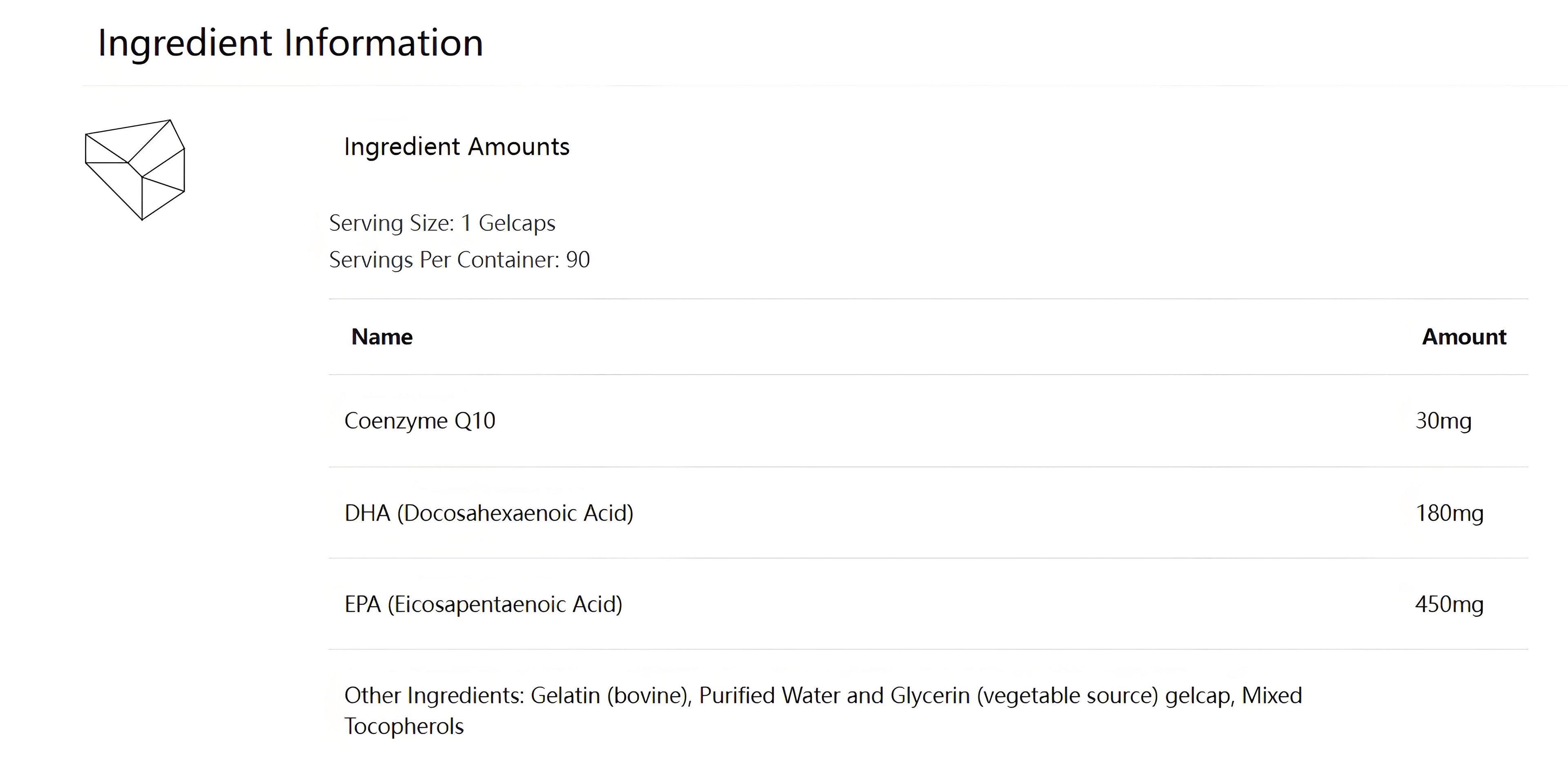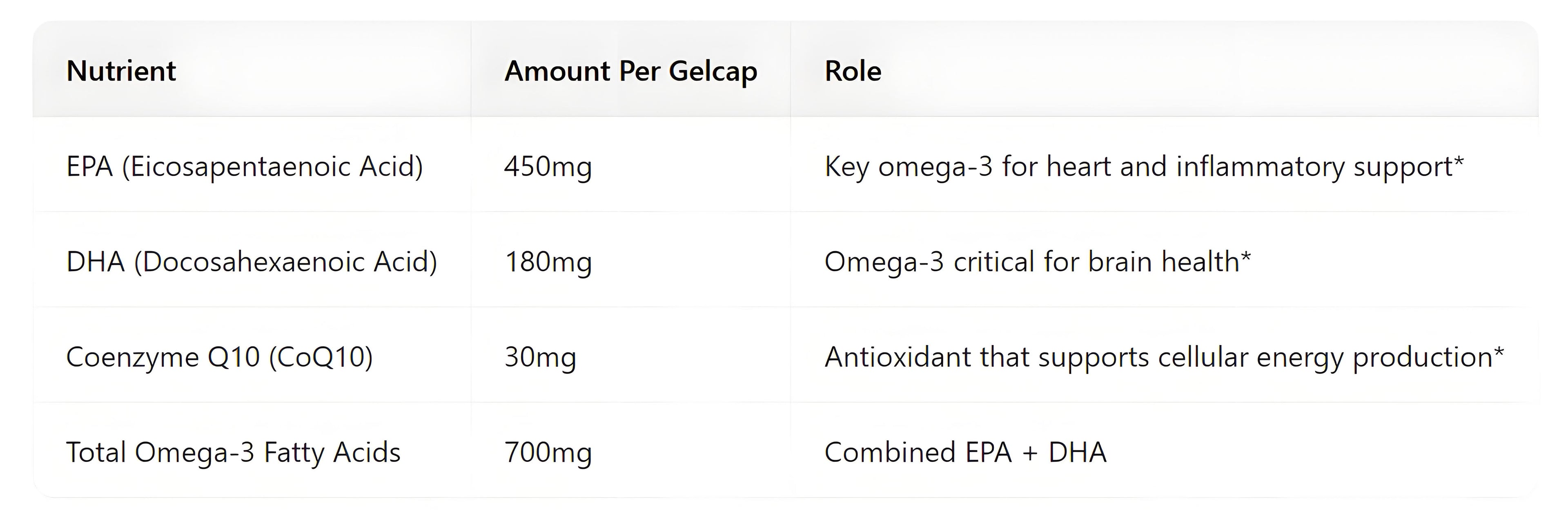 Each gelcap delivers targeted doses of omega-3s and CoQ10, plus minimal other ingredients: