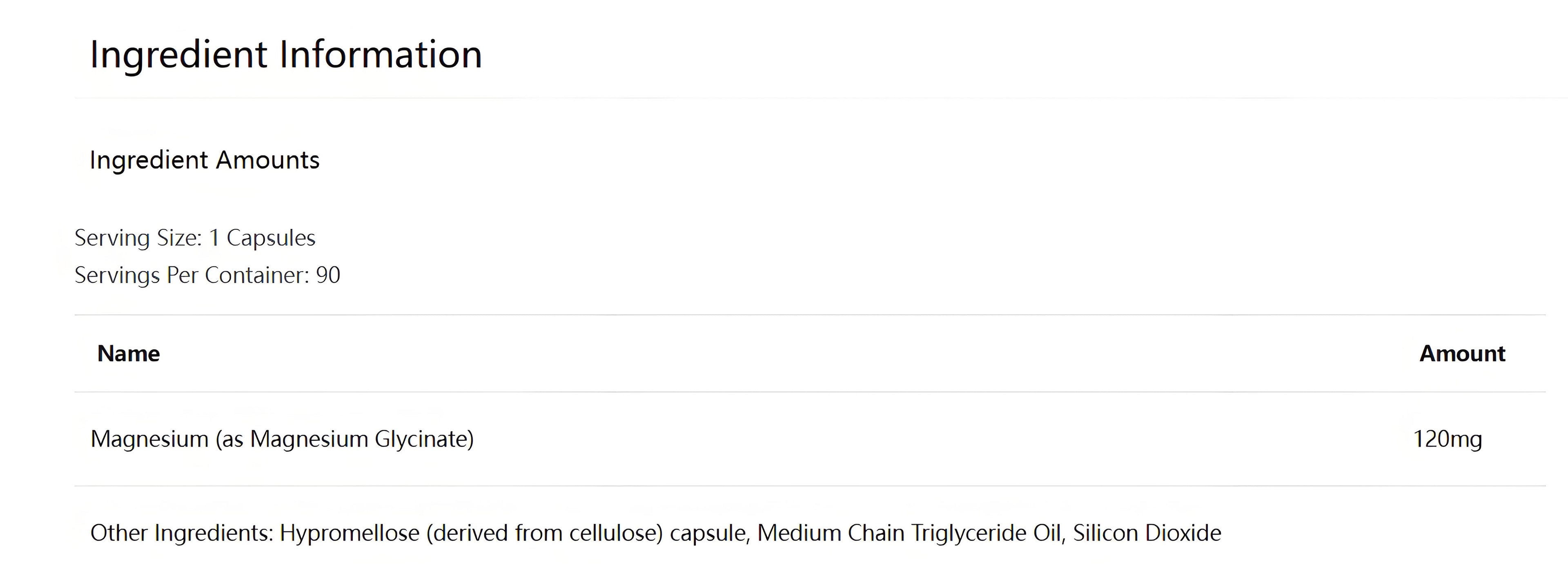 - Active Ingredient: Magnesium (as Magnesium Glycinate) – 120mg per capsule.
